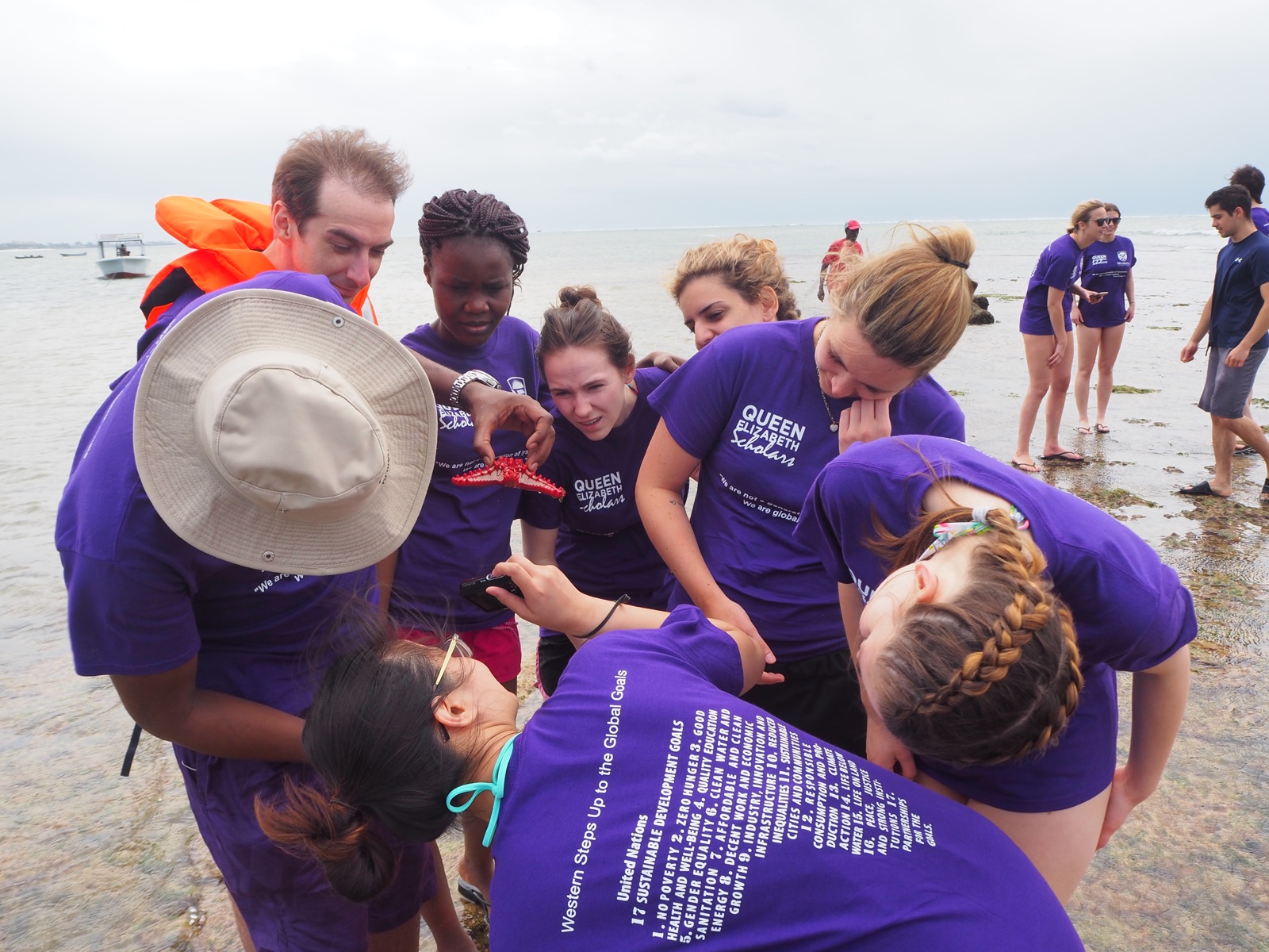 Today was the first day we all donned our purple Queen Elizabeth Scholars shirts as representatives of Western University. We headed out to meet our boats, student cards in hand, excited to explore the Mombasa Marine Reserve. The only damper on our mood being the two students feeling ill unable to join us. Before we headed out on the boats we had to take a mandatory group picture. This was easier said then done of course. With the perfect shot captured, we headed out under the careful direction of local tour guides. We made our way through the turbulent sea, waves crashing over the bow, to the offshore tidal flats. Once safely on the tidal flats, we began exploring, not really sure what we would find in the knee deep water but as the tide receded we were able to find more interesting creatures. Our most interesting find was these colourful starfish, brilliant shades of red, yellow, and orange. They quickly became the center of our attention and the focal point of a photo shoot. Amid this carefree moment, we truly bonded as a group, discovering something new together. For the first time we were no longer thesis or professional students, domestic or international students, but Global Health Systems students.