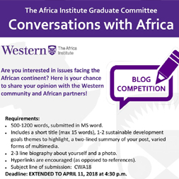 Conversations with Africa is a two-way dialogue between students at Western and students studying on the African continent meant to share ideas, engage with valuable initiatives and meet challenges. Students write about a key issue or topic based on their expertise, research or experiences with Africa. Students should submit their blog posts to conversationswithafrica@uwo.ca with the subject line “CWA18” and members of the Africa Institute Graduate Committee will review and publish them online. The Africa Institute Advisory Committee will then judge the winners of the Blog Competition in May, 2018.